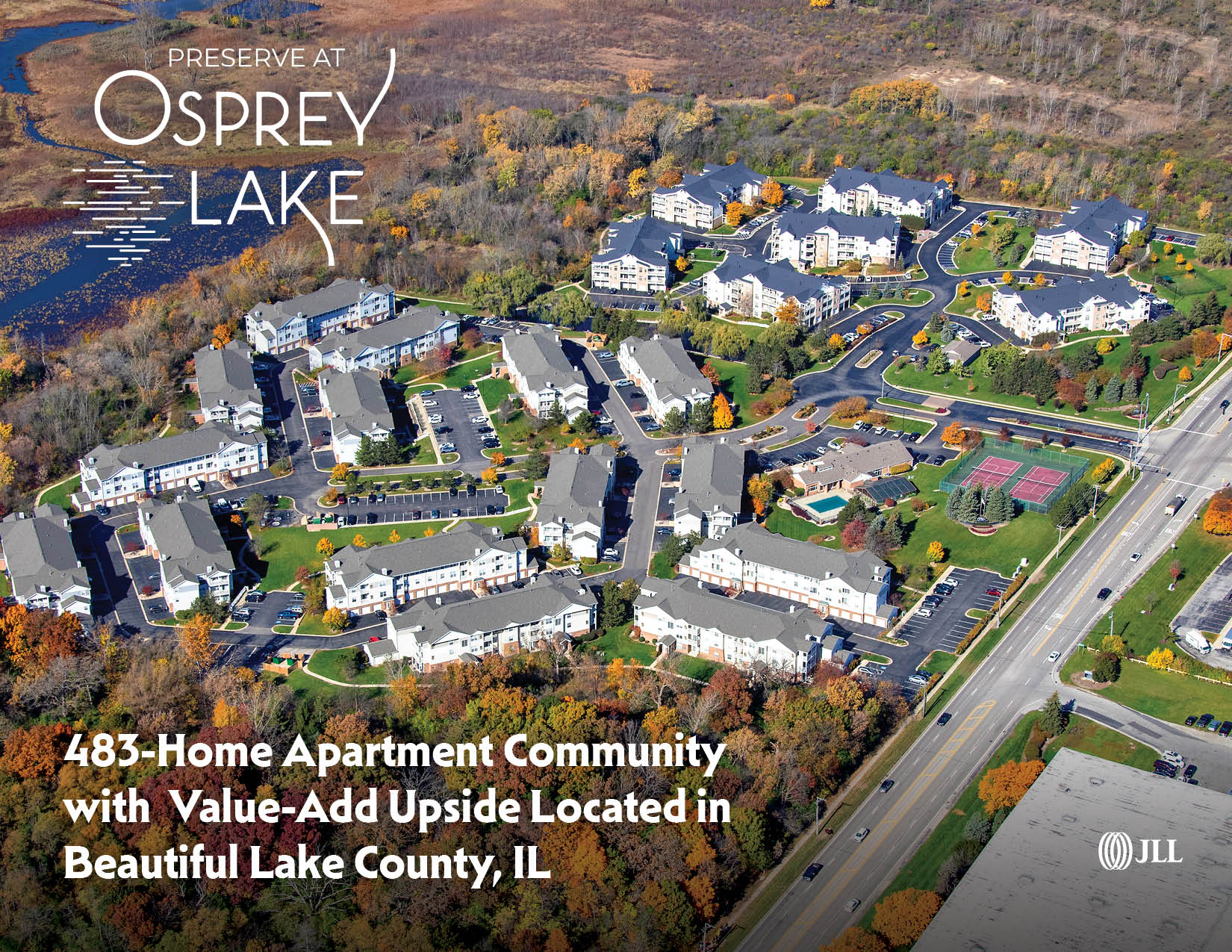 Jones Lang LaSalle Americas (Illinois), L.P. (JLL) is pleased to present Preserve at Osprey Lake, a beautiful 483-home garden-style apartment community located Chicago’s northern suburb, Gurnee. Originally built in 1997, the property is nestled in an 87-acre tree-lined oasis and offers residents spacious layouts ranging from studio – 2 bedrooms with a large average unit size of 938 SF. Preserve at Osprey Lake provides investors the opportunity to continue the value-add strategy through select interior enhancements with over 55% units ready for renovations.