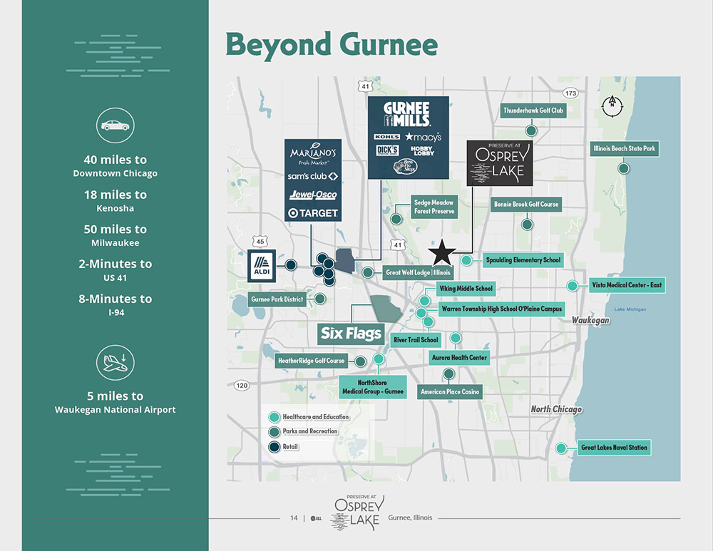 Situated in Chicago’s northern suburbs, the property benefits from proximity to I-94, providing easy access to both Chicago and Milwaukee. The Preserve at Osprey is minutes away from Six Flags Great America, Great Wolf Lodge, roughly 200 stores at the Gurnee Mills shopping center and a plethora of major employers. This rare investment opportunity is available on a free and clear basis.
