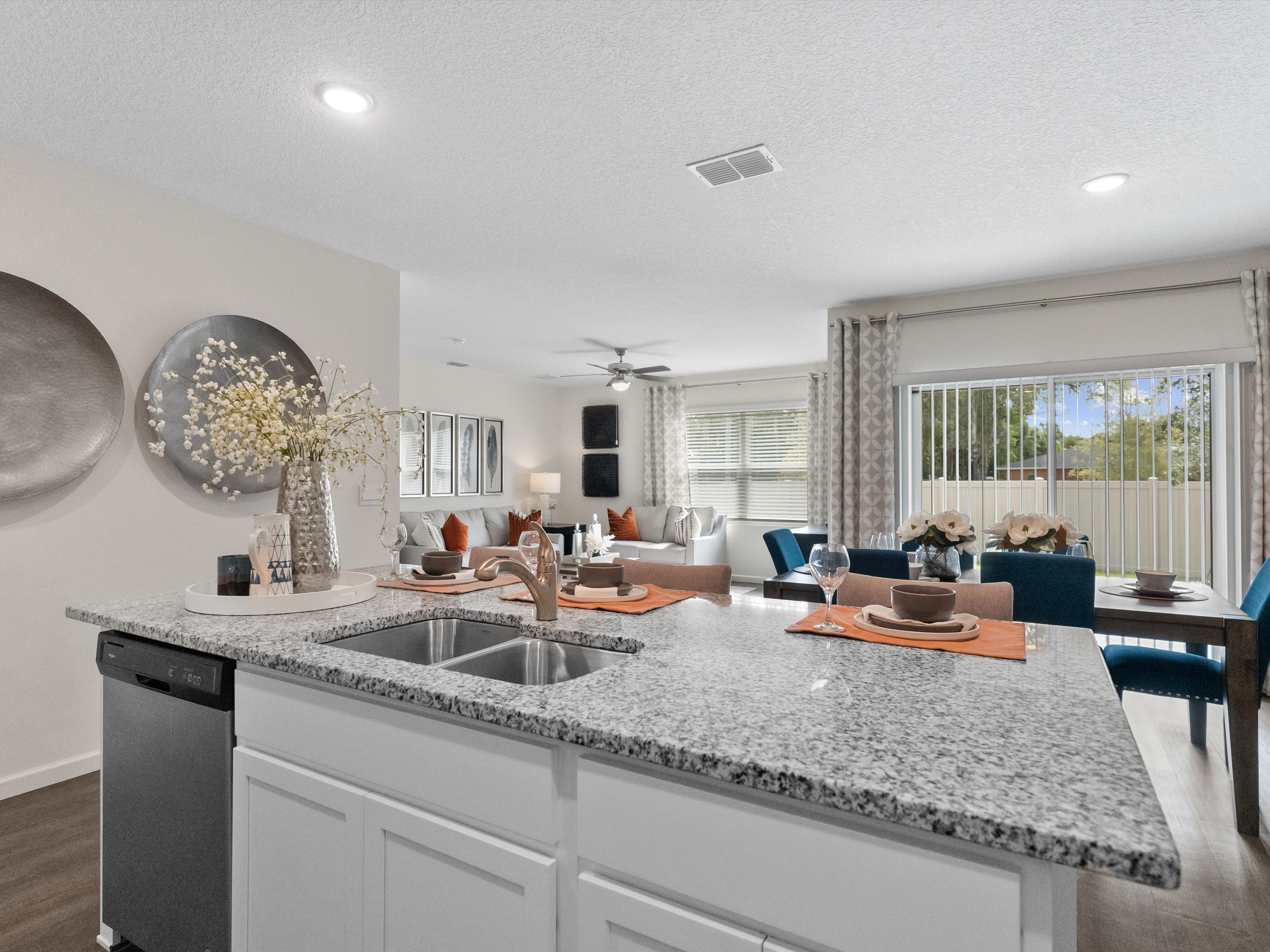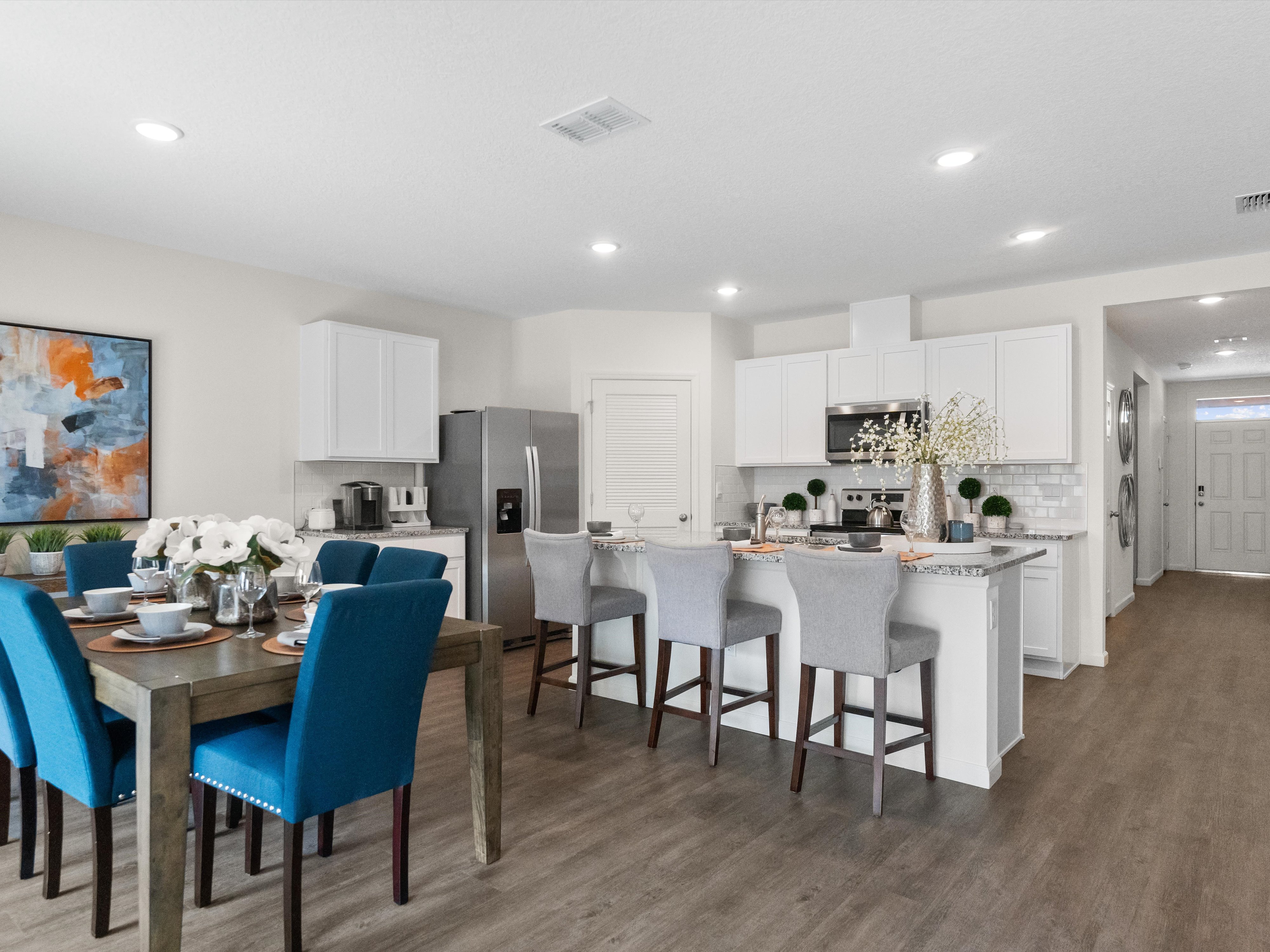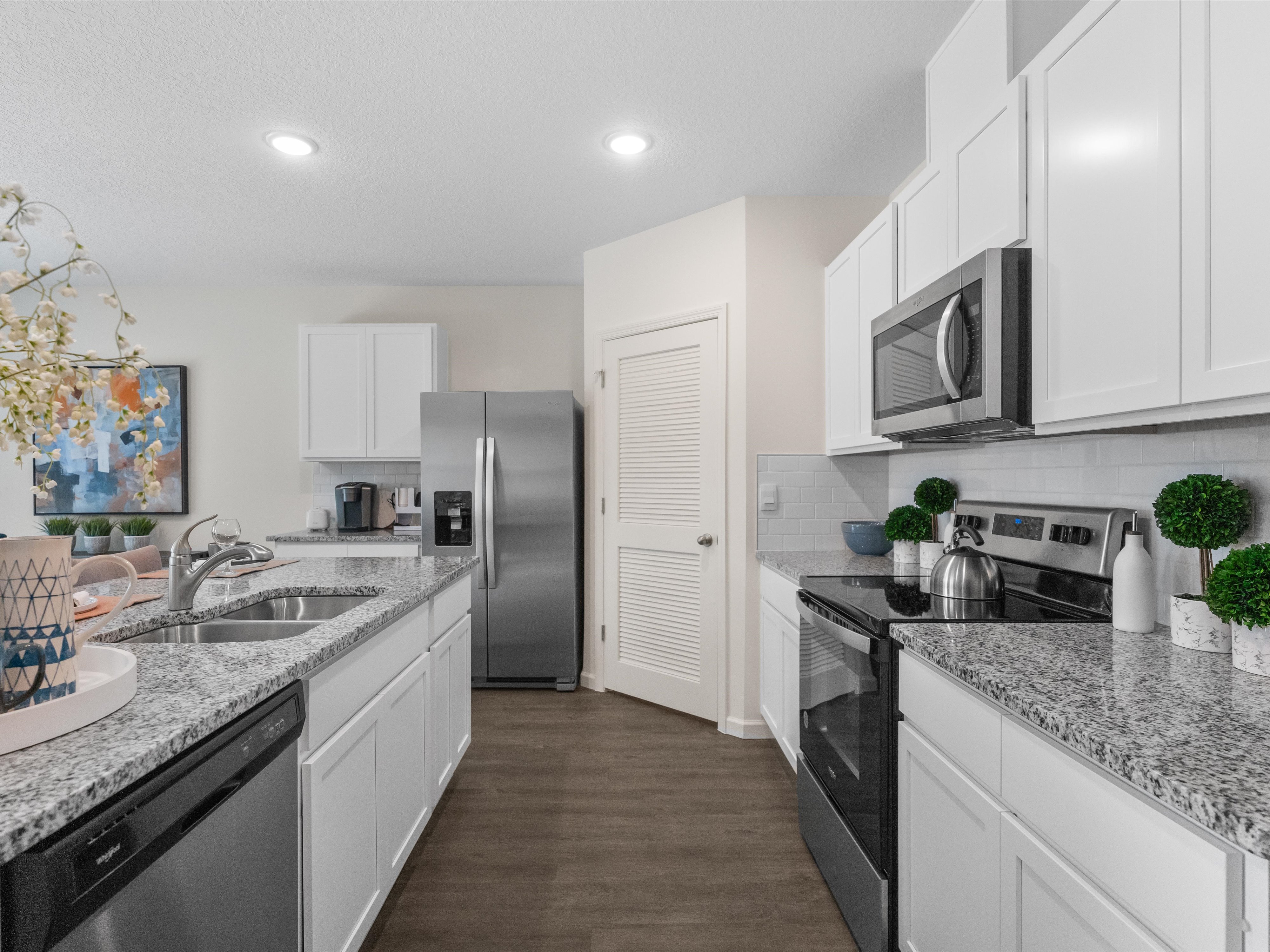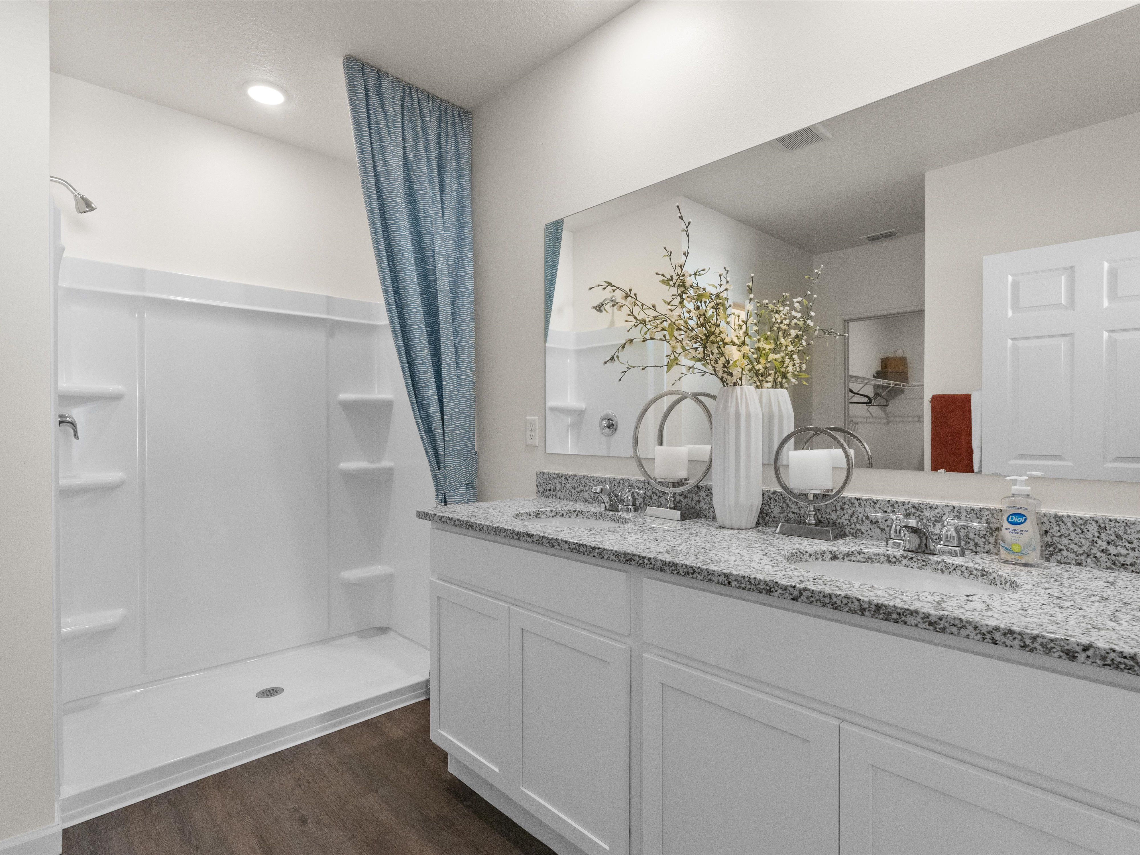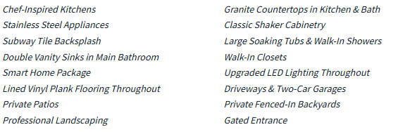 Each home is equipped with modern and high-quality amenities, including large soaking tubs and walk-in showers, chef-inspired kitchens with granite countertops, stainless steel appliances, and side-by-side refrigerators. Classic, shaker-style cabinetry and subway tile backsplashes add elegance to the space, while double vanity sinks in the main bathroom offer added convenience. Walk-in closets provide ample storage, and a smart home package ensures modern connectivity and security.