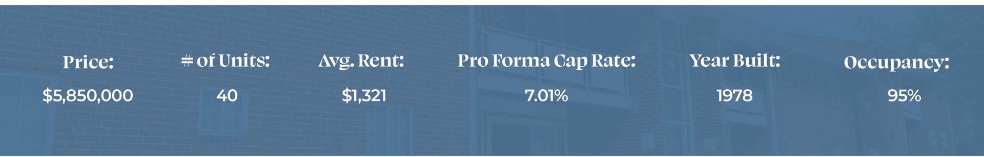 The property consists of 40 units with a mix of (16) 1 Br-1 Ba and (24) 2 Br-1 Ba, with many units having private balconies or patios. There is also a laundry facility on-site, a surface parking lot, and an outdoor picnic area. Prior ownership initiated a comprehensive renovation program in 2018, upgrading 75% of the units. This extensive scope included the installation of new appliances, modern cabinets, resurfaced countertops, updated bathrooms, and contemporary plank flooring. Current ownership has skillfully built upon this foundation, further enhancing 20 units with new cabinet and countertop finishes, modernized bathrooms, the installation of LVP flooring throughout, and updated hardware and fixtures, ensuring a premium living environment. Beyond interior unit upgrades, the current owner has proactively addressed critical infrastructure and common areas, completing significant projects such as roof replacements, resurfacing of the parking lots, essential plumbing line work, and aesthetic and functional upgrades to common areas, all contributing to the property’s long-term value and appeal.