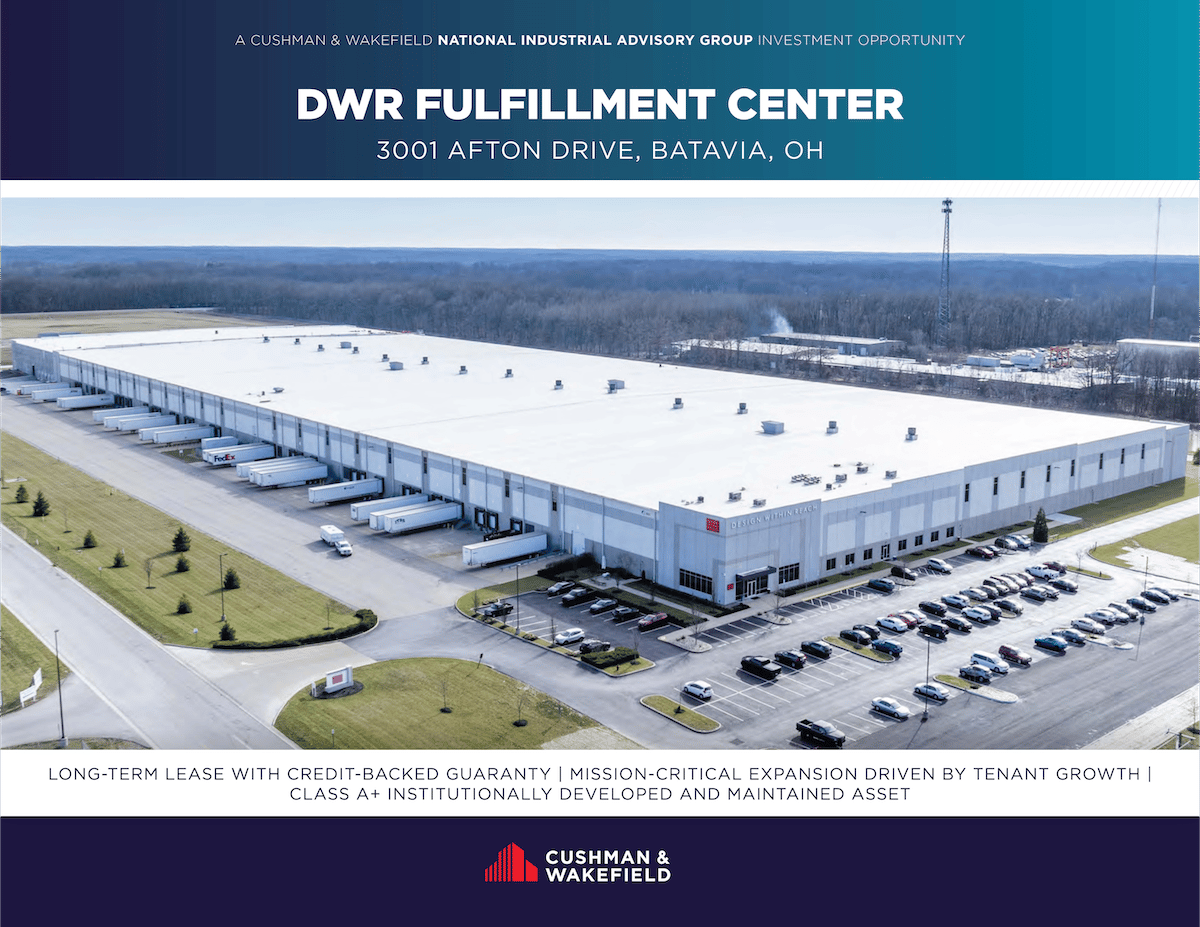 Cushman & Wakefield’s National Industrial Advisory Group has been retained as exclusive advisor for the sale of the DWR Fulfillment Center (the “Property”), a modern, Class A+ warehouse located at 3001 Afton Drive in Batavia, OH (Cincinnati MSA).