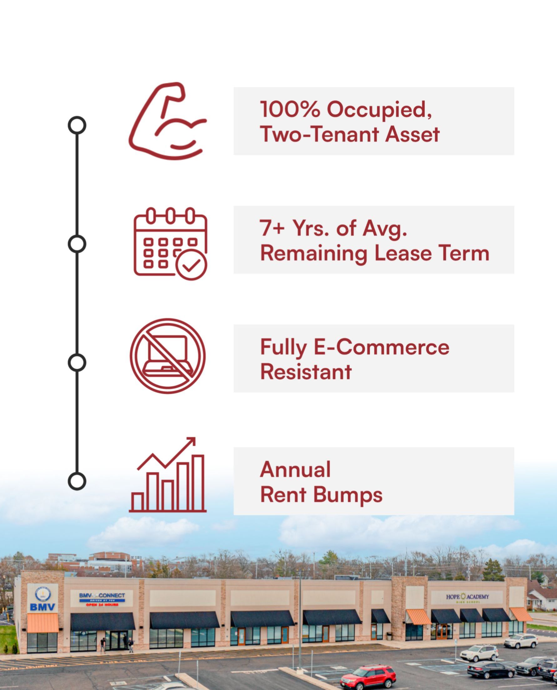 With two e-commerce resistant and macro-economic insulated tenants - Hope Academy High School and government tenant - Indiana BMV, both on longer term leases
