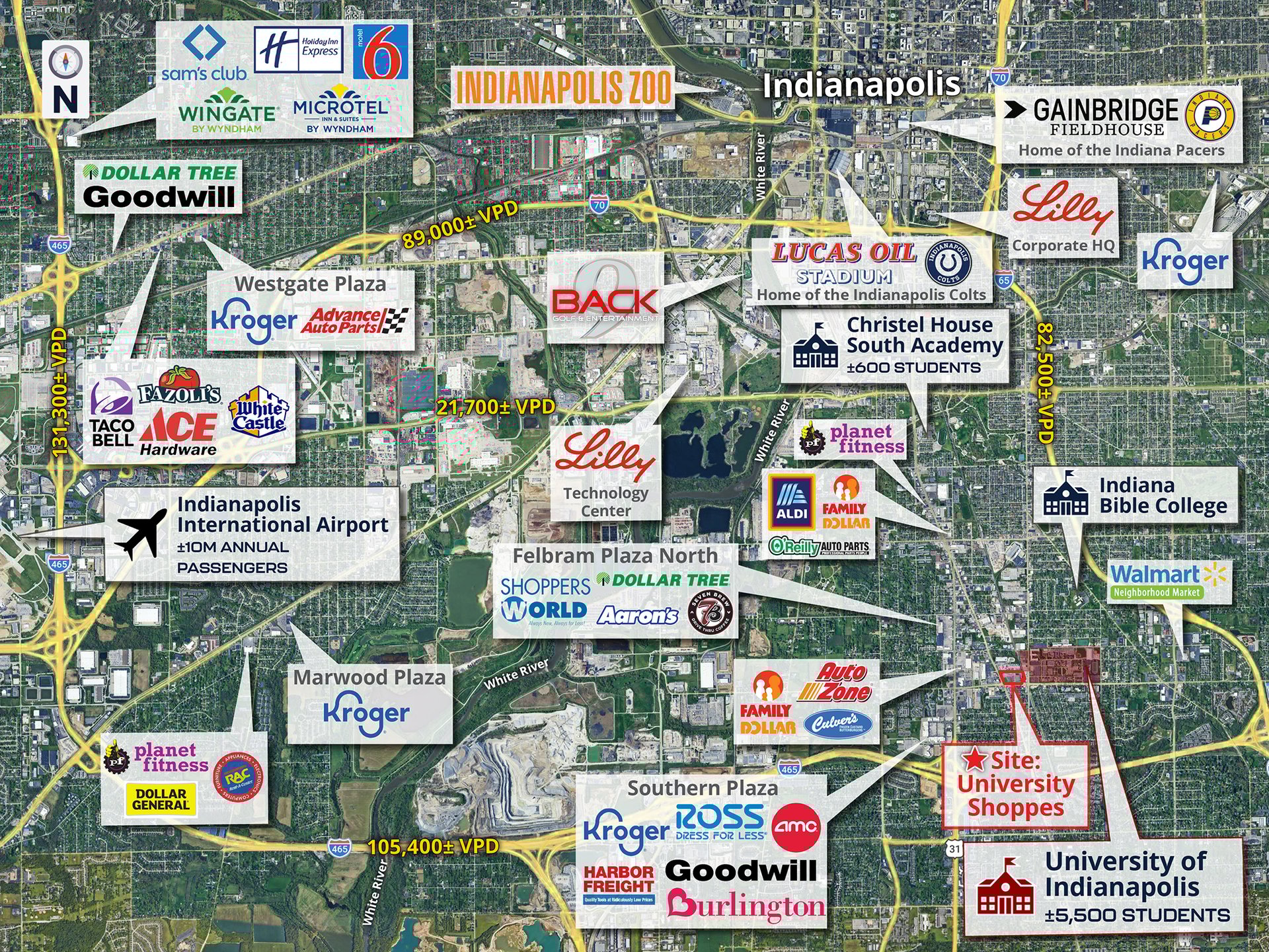 Conveniently situated just 10 minutes south of the middle of Downtown Indianapolis, the Property boasts a strategic, high traffic location between two signalized intersections and immediately adjacent to the 65-AC campus of the University of Indianapolis. Home to roughly 5,000 students from over 40 states and 60 countries, the University of Indianapolis has been a private institution within the heart of the city since 1902, offering over 100 undergraduate degree programs, 32 master’s degree programs, and 5 doctoral programs, along with 25 NCAA-II varsity sports programs.