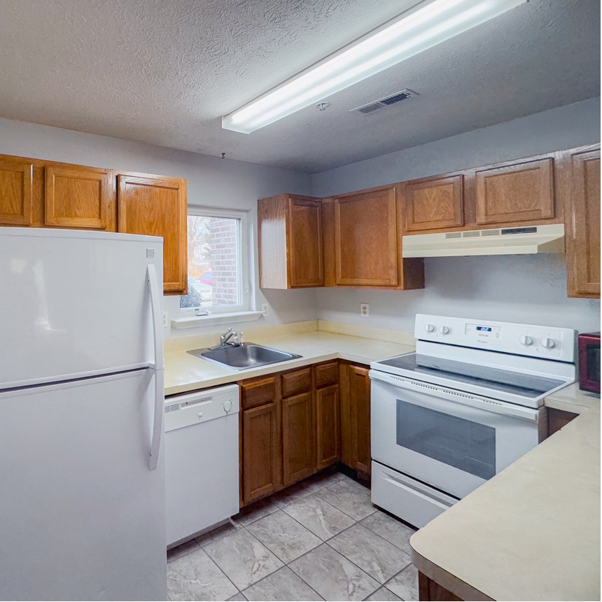 - Typical unit features include white appliances, formica countertops, wood cabinets, and laminate/carpet/tile flooring