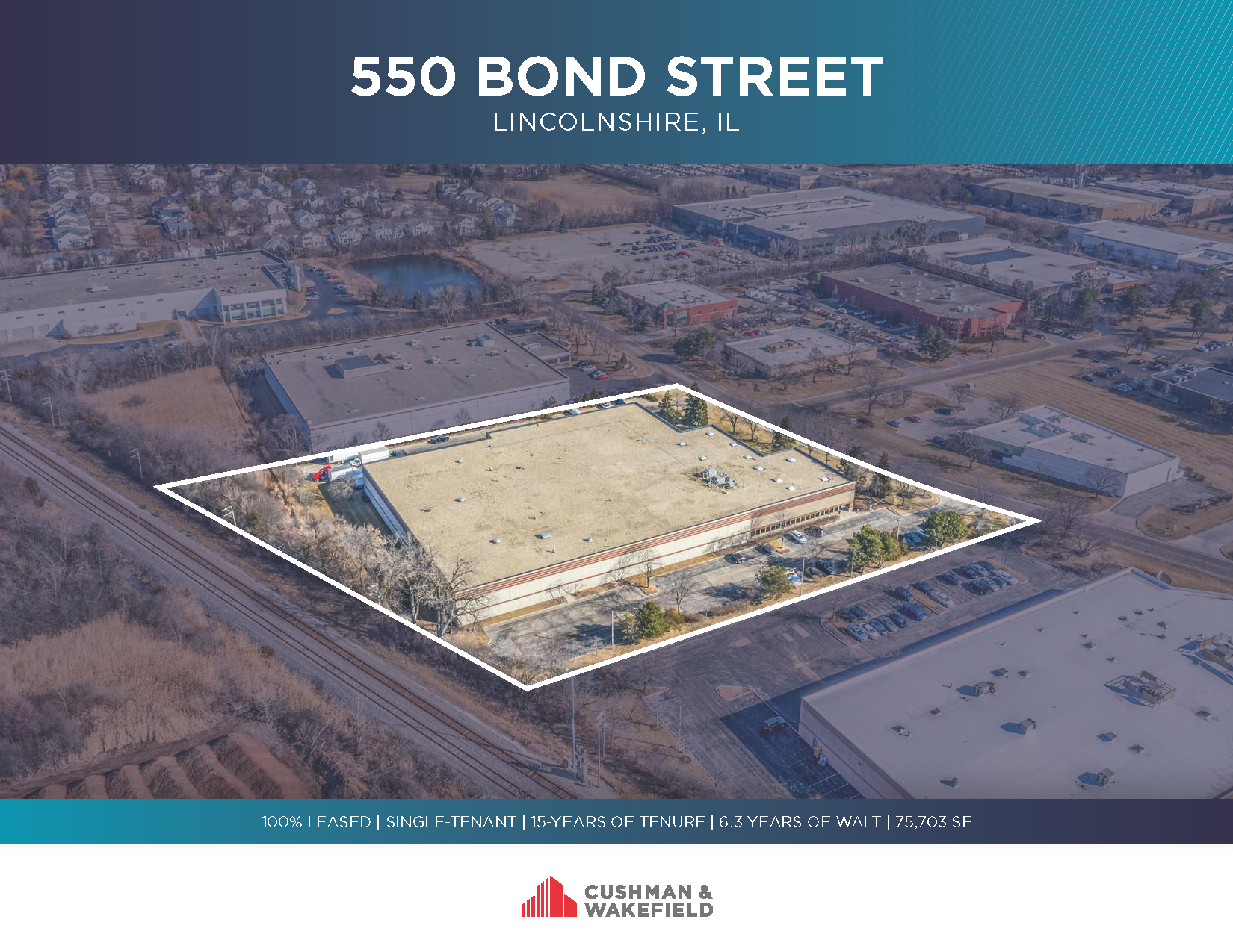 Cushman & Wakefield has been retained as the exclusive advisor to ownership in the sale of 550 Bond Street, a 75,703 square foot shallow-bay industrial facility located in Lincolnshire, Illinois. The building is 100% leased to Interior Investments, LLC (d/b/a Continua Interiors), a Midwest-based contract interiors company providing furniture and workplace solutions to commercial users that has occupied the asset for approximately 15 years. The current lease extends through September 2032 and features 3.50% annual rent escalations, providing stable and growing in-place cash flow.