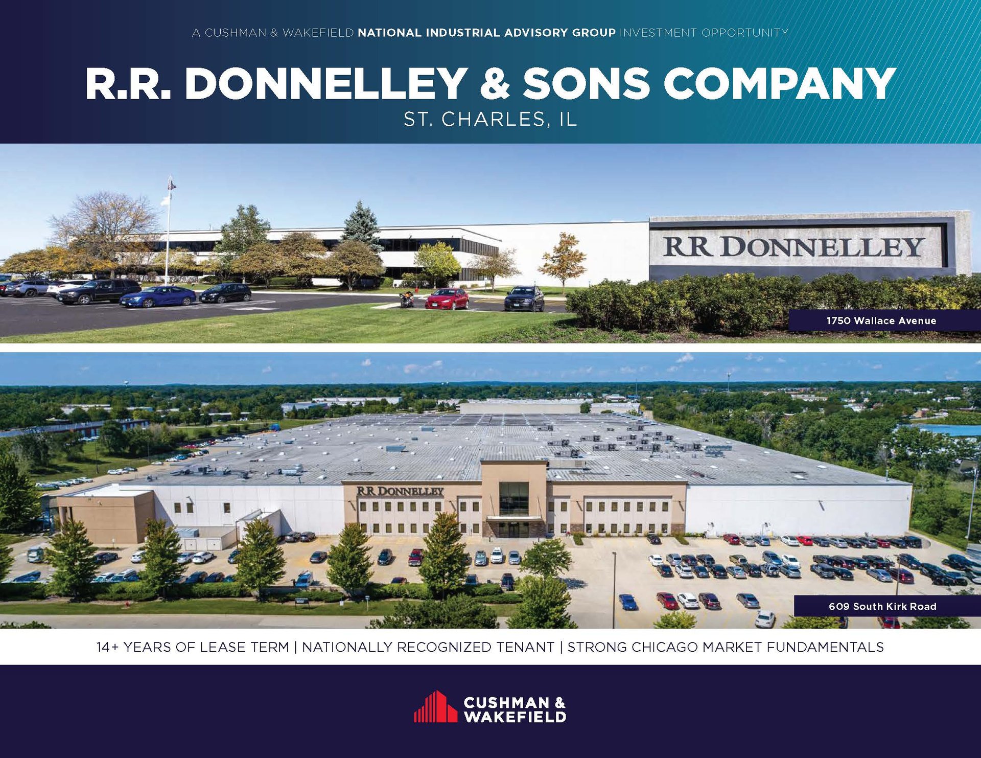 Cushman & Wakefield’s National Industrial Advisory Group has been retained by ownership as its exclusive advisor in the sale of the R.R. Donnelley Portfolio (the “Portfolio”), located at 609 South Kirk Road and 1750 Wallace Avenue in St. Charles, IL. The Portfolio totals 783,668 square feet in the Southern Fox Valley submarket of Chicago.